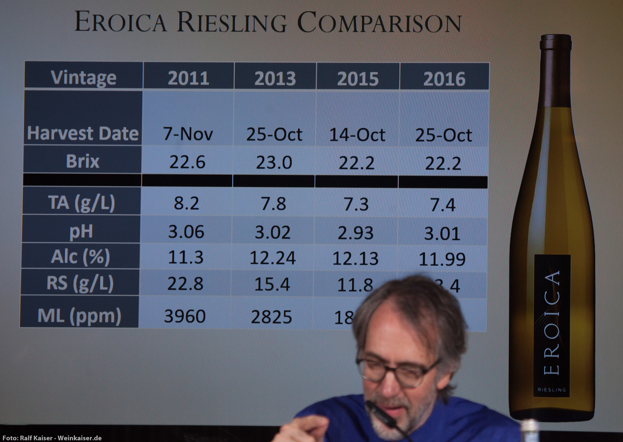 Eroica Riesling Jahrgangsvergleich, zeitgemäß niedrige Alkoholwerte und knackige Säure trotz wärmeren Bedingungen in der „Neuen Riesling Welt“.